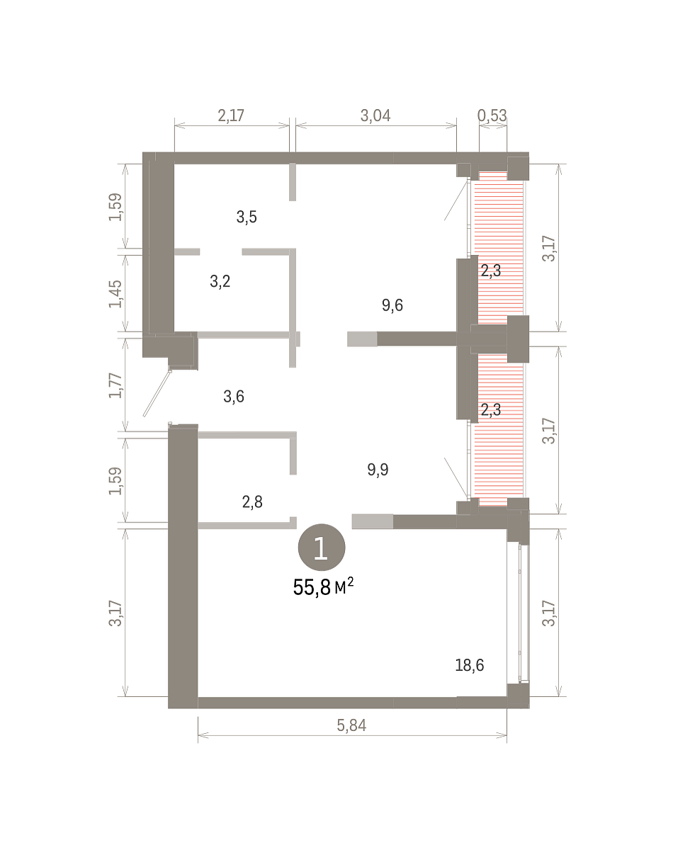 Площадь (общ/жил/кух), м2: 55.76/19.52/18.61