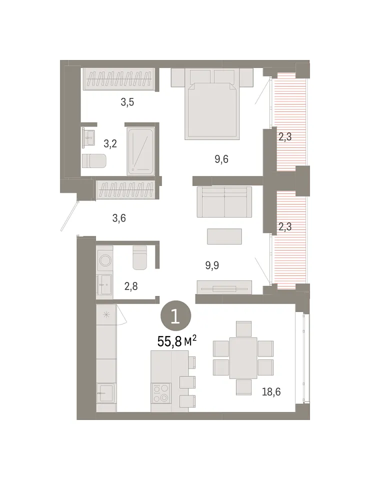 Площадь (общ/жил/кух), м2: 55.76/19.52/18.61