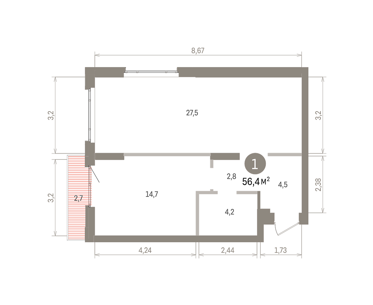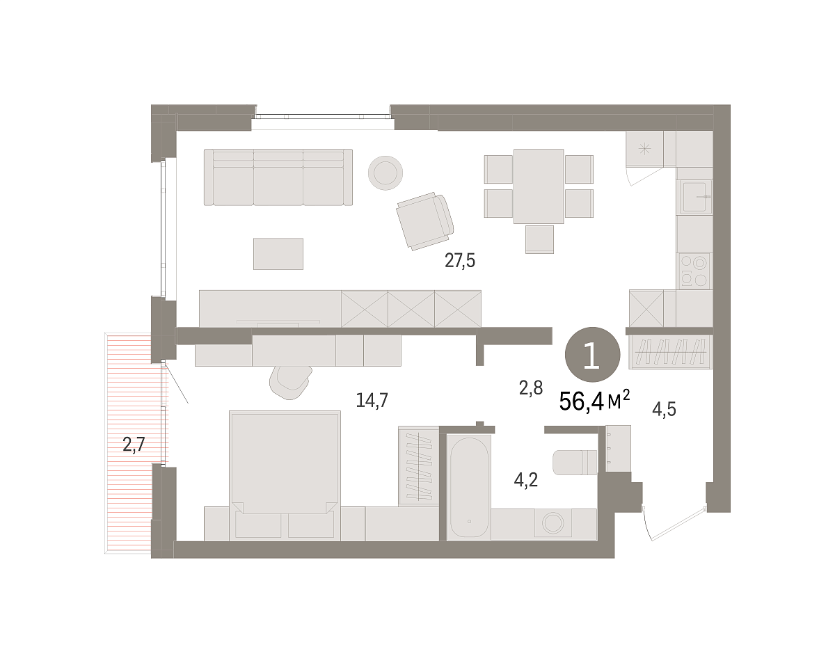 Площадь (общ/жил/кух), м2: 56.4/14.7/27.5