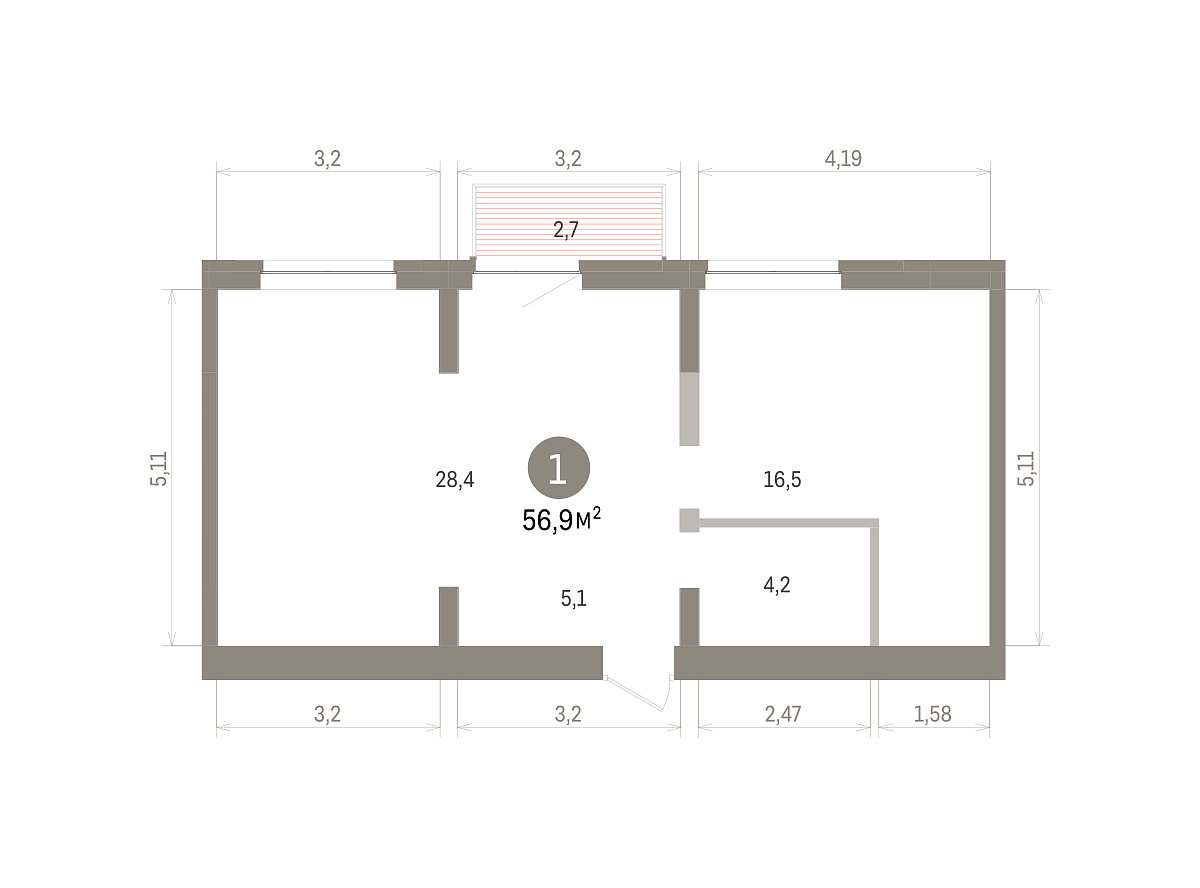 Площадь (общ/жил/кух), м2: 56.9/13.6/28.4