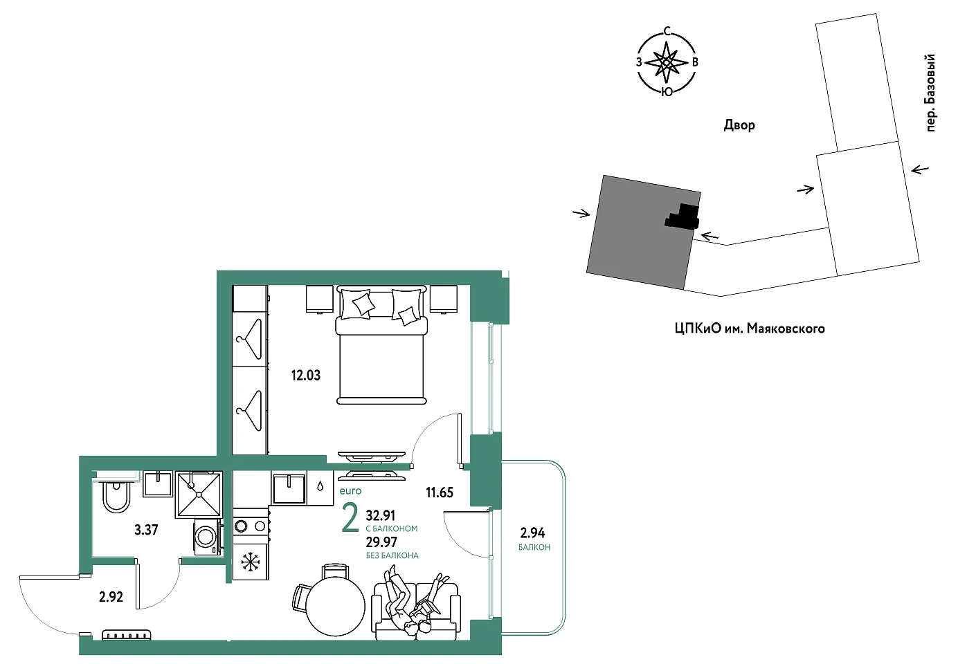 Количество комнат: 2, 32.91 кв.м.