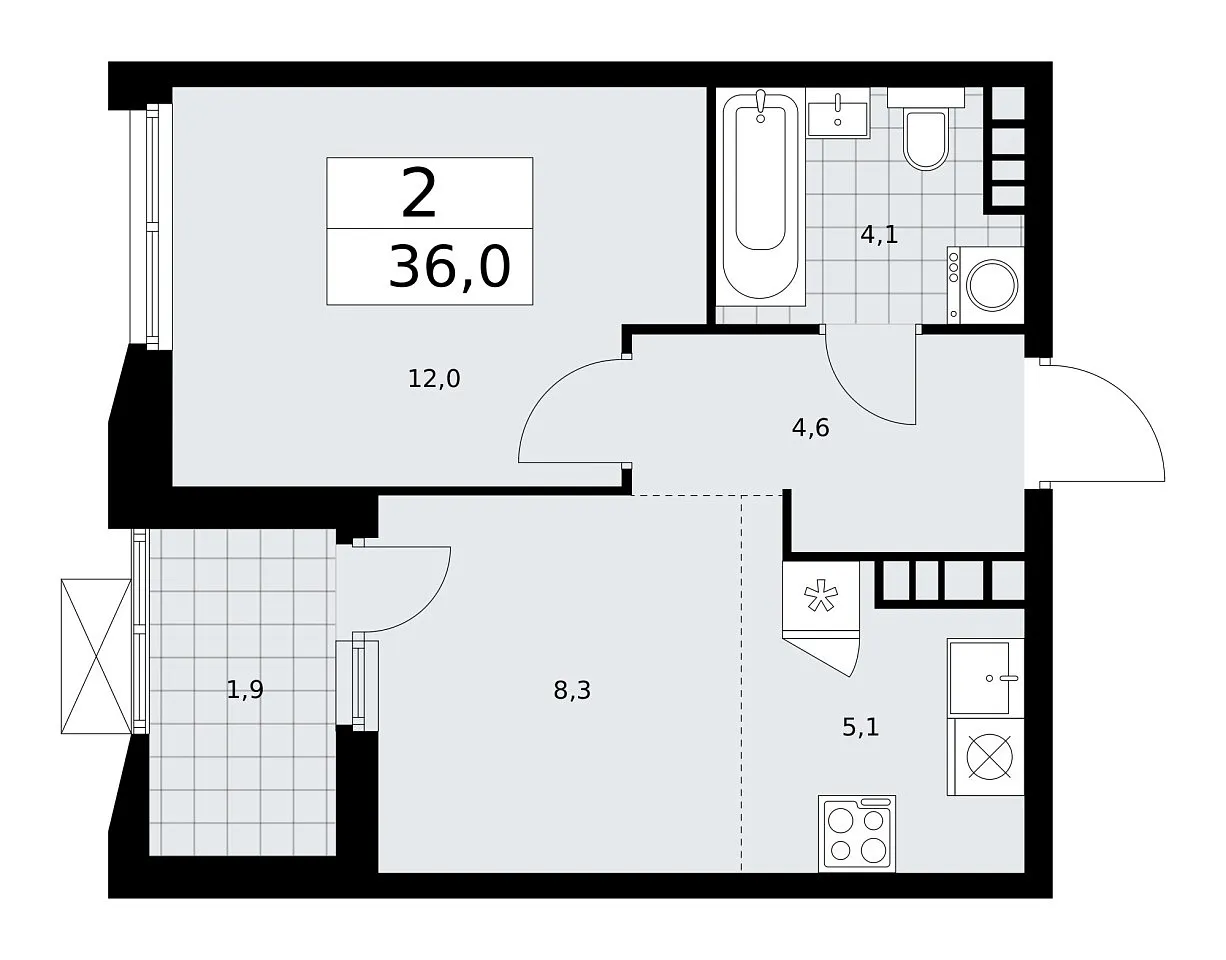Количество комнат: 2, 36 кв.м.