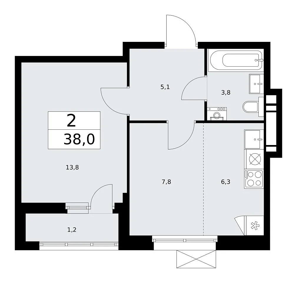 Количество комнат: 2, 38 кв.м.