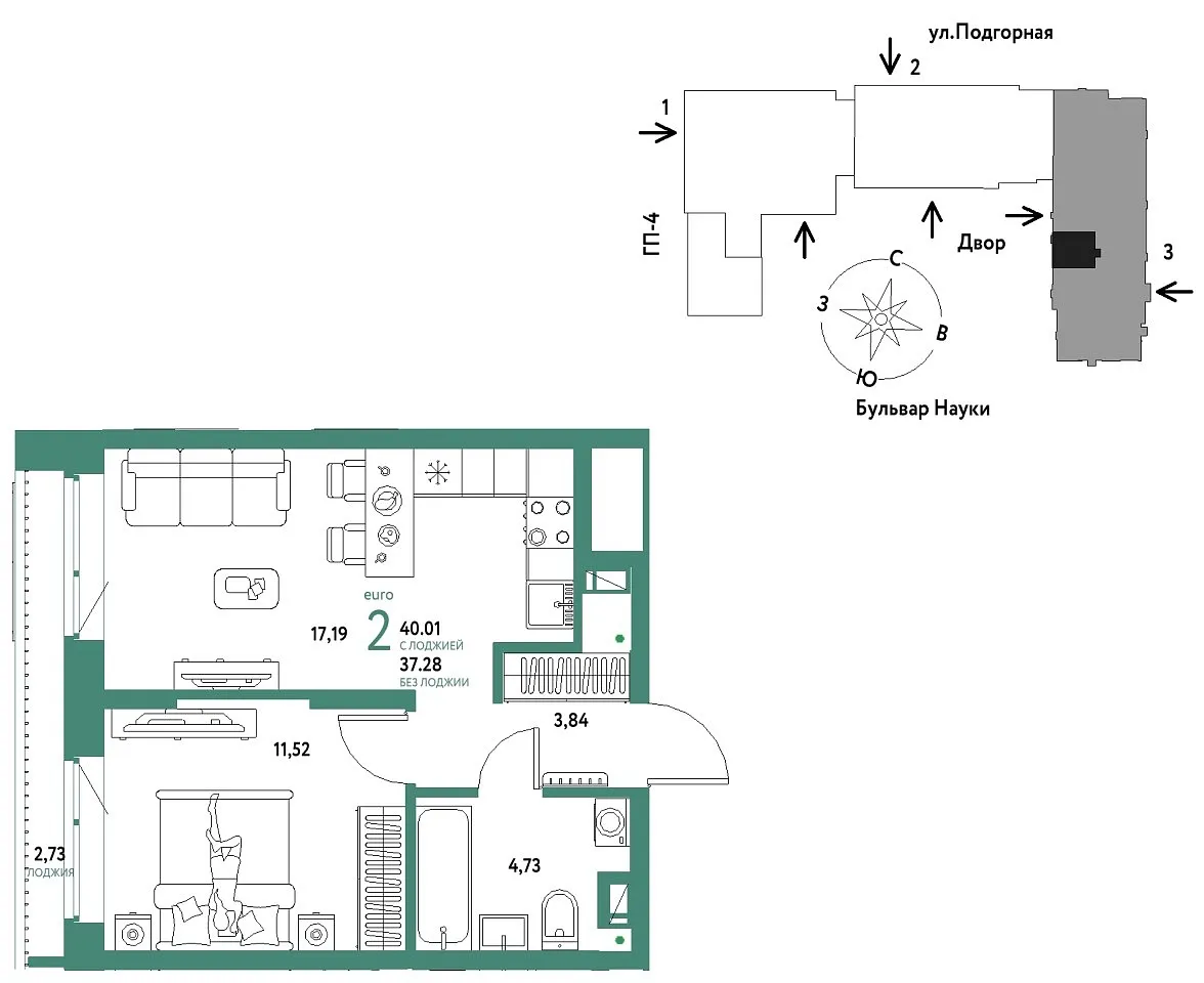 Количество комнат: 2, 40.01 кв.м.