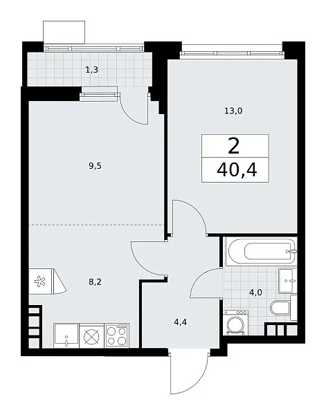 Количество комнат: 2, 40.4 кв.м.