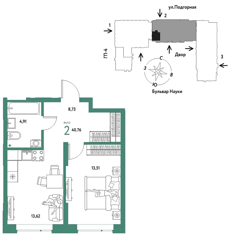 Общая площадь 40.76 м2