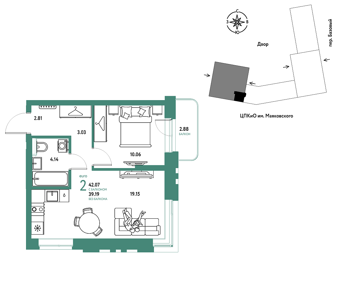 Количество комнат: 2, 42.07 кв.м.