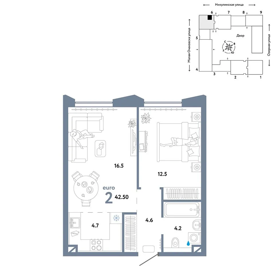 Площадь (общ/жил/кух), м2: 43.1/10.6/21.8