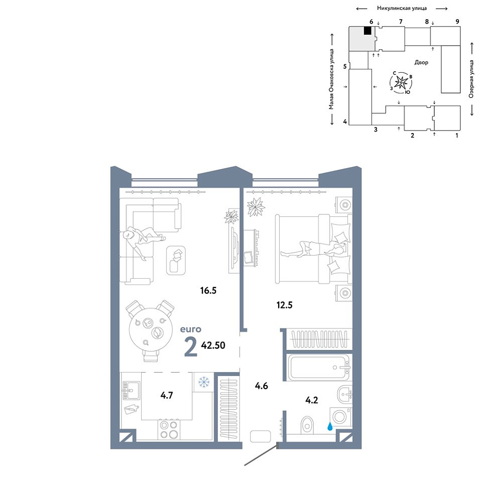 Площадь (общ/жил/кух), м2: 42.9/29.2/—
