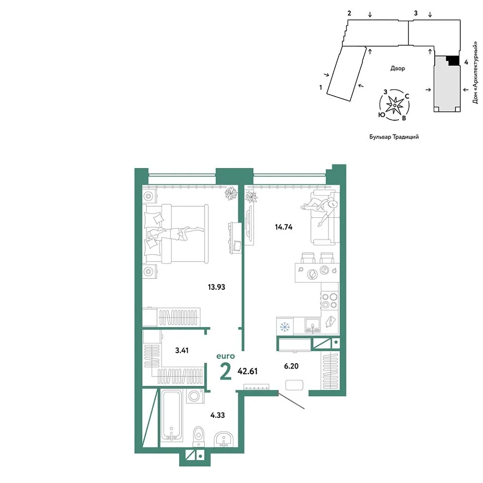 Купить новую двухкомнатную квартиру 42.61 м² на 9/15 этаже в ЖК «Домашний», г. Тюмень за 6422222 ₽ | Агентство недвижимости «Вплюсе.Топ» — Недвижимость России