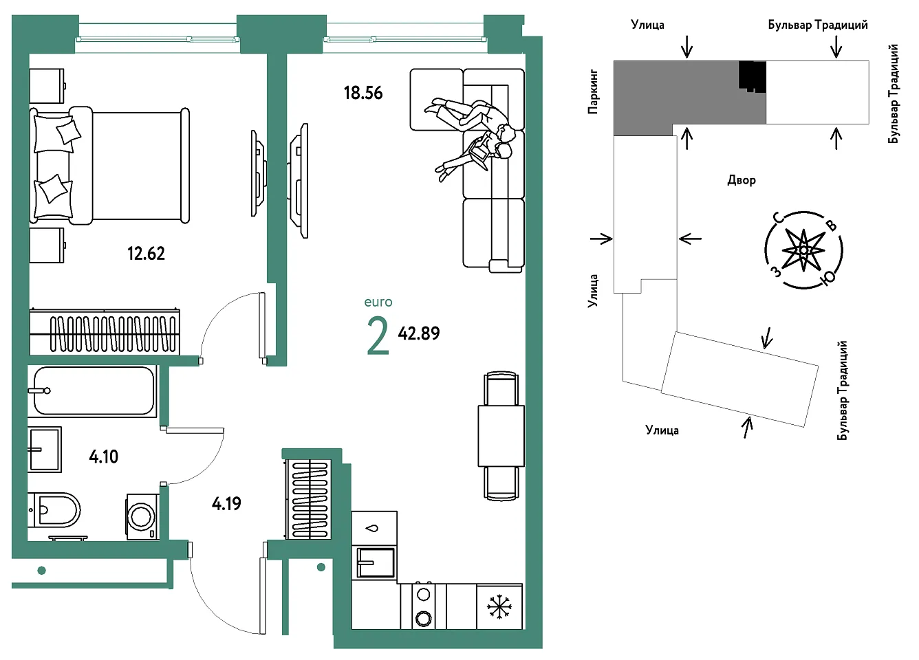 Купить новую двухкомнатную квартиру 42.89 м² на 4/15 этаже в ЖК «Домашний», г. Тюмень за 6642105 ₽ | Агентство недвижимости «Вплюсе.Топ» — Недвижимость России