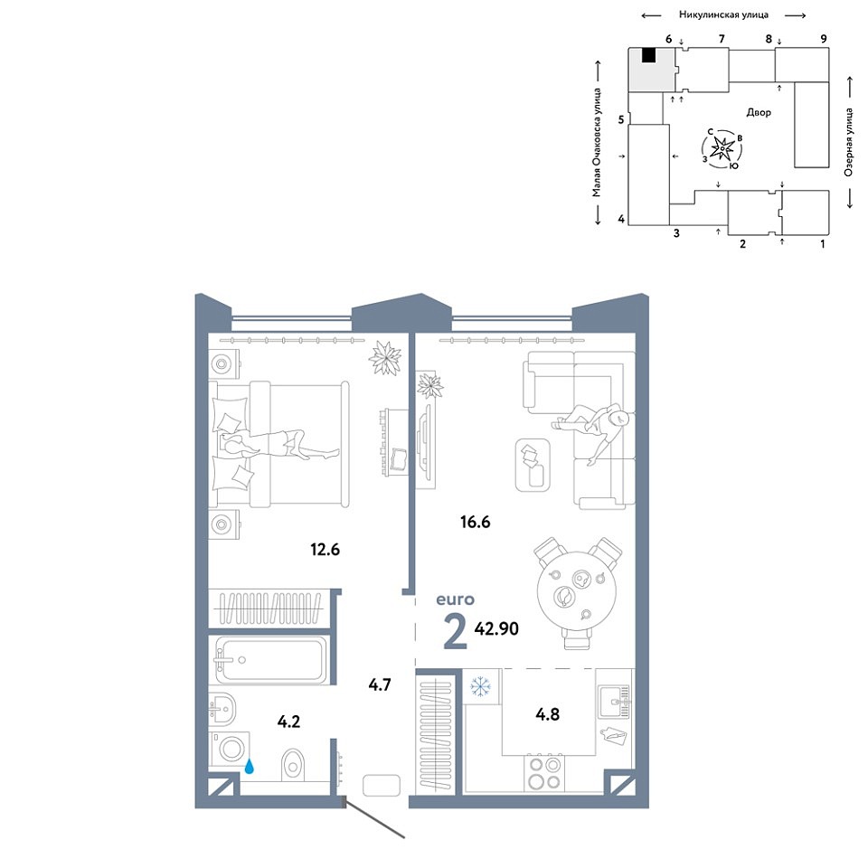 Общая площадь 42.9 м2