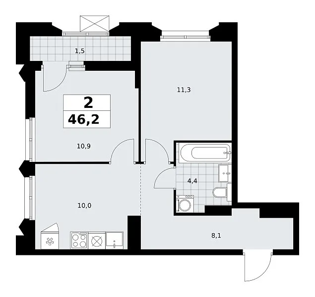 Количество комнат: 2, 46.2 кв.м.