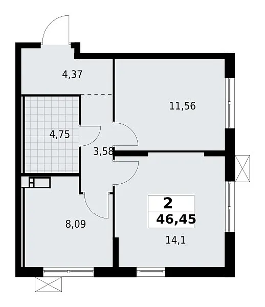 Количество комнат: 2, 46.45 кв.м.