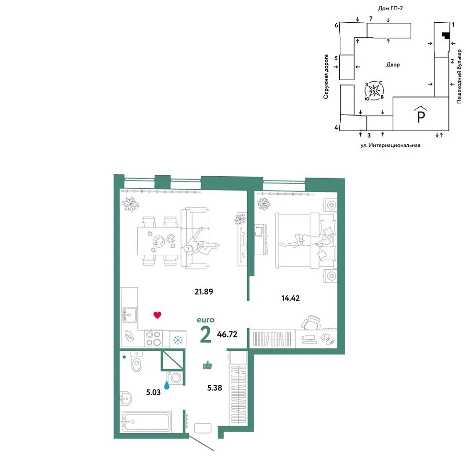 Количество комнат: 2, 46.72 кв.м.
