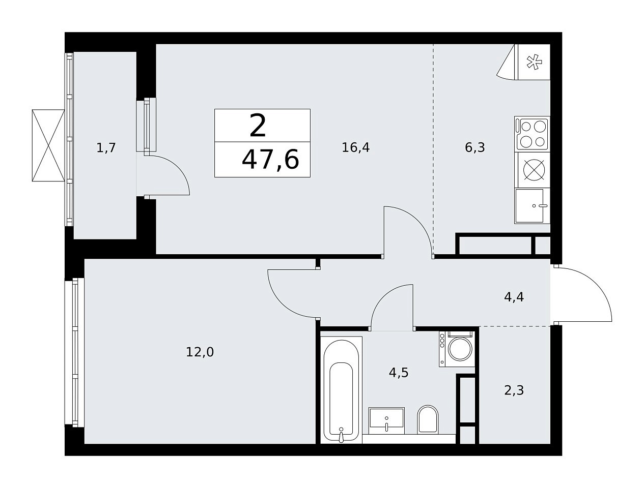 Количество комнат: 2, 47.6 кв.м.