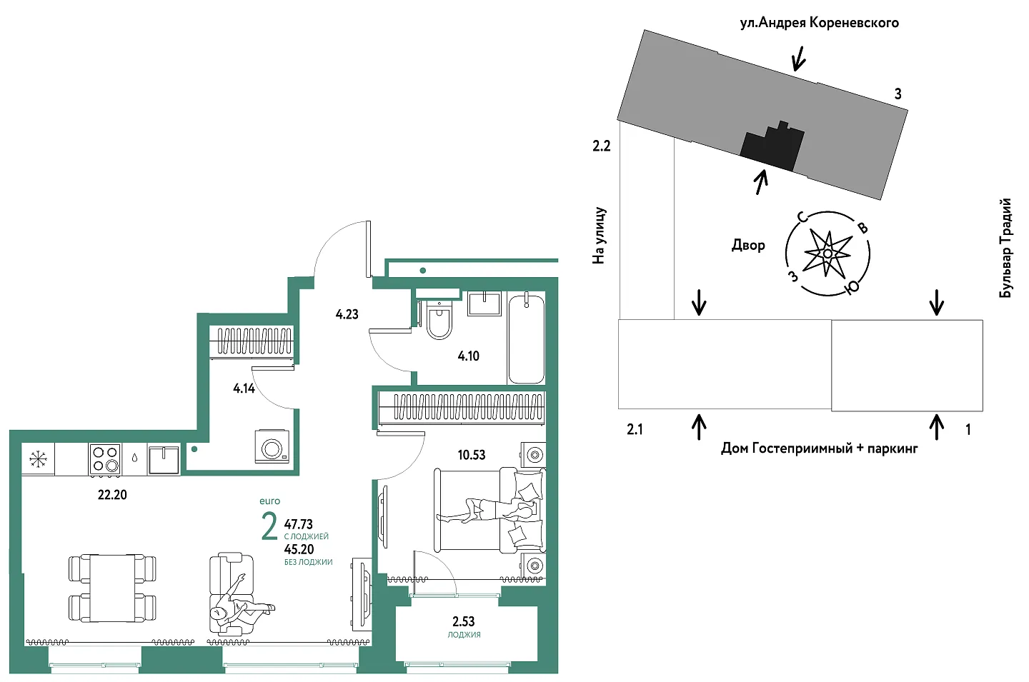 Количество комнат: 2, 47.73 кв.м.