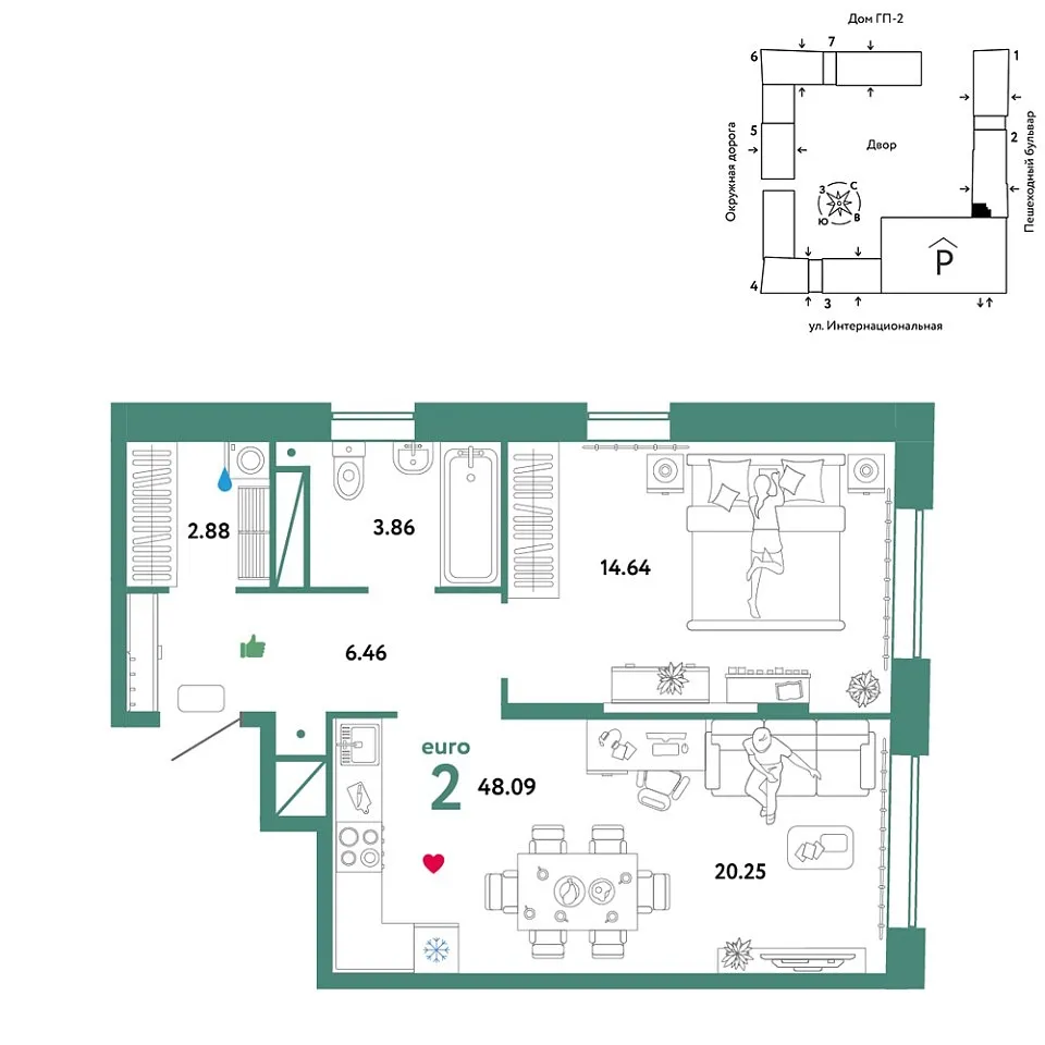 Купить новую двухкомнатную квартиру 48.09 м² на 12/16 этаже в ЖК «Юнион», г. Тюмень за 7097826 ₽ | Агентство недвижимости «Вплюсе.Топ» — Недвижимость России