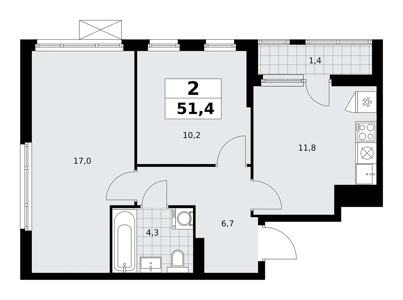 Количество комнат: 2, 51.4 кв.м.