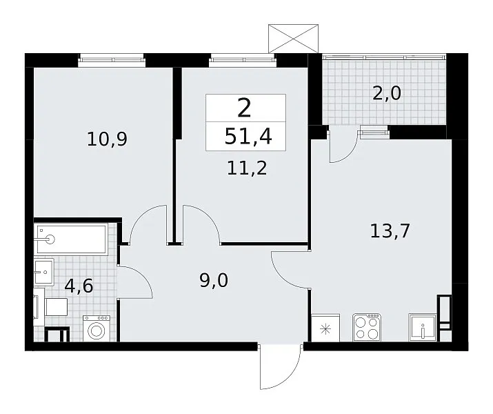 Количество комнат: 2, 51.4 кв.м.