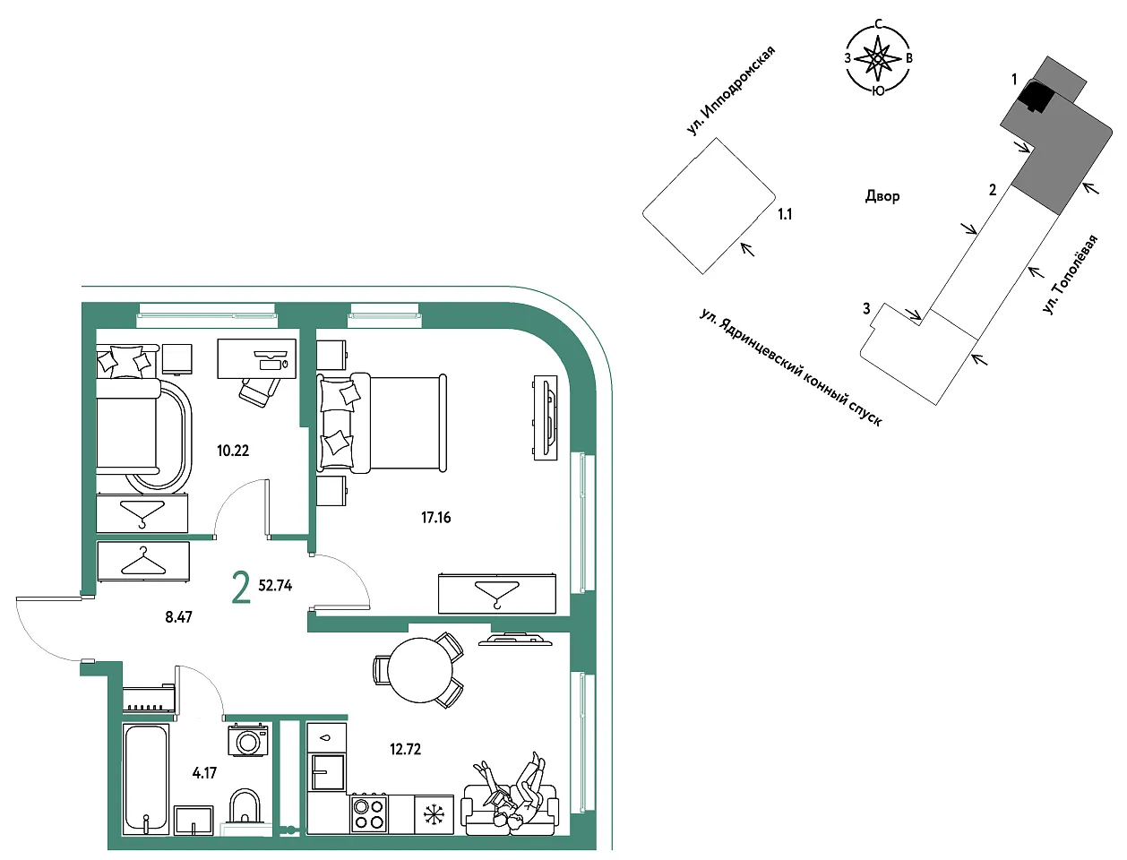 Количество комнат: 2, 52.74 кв.м.