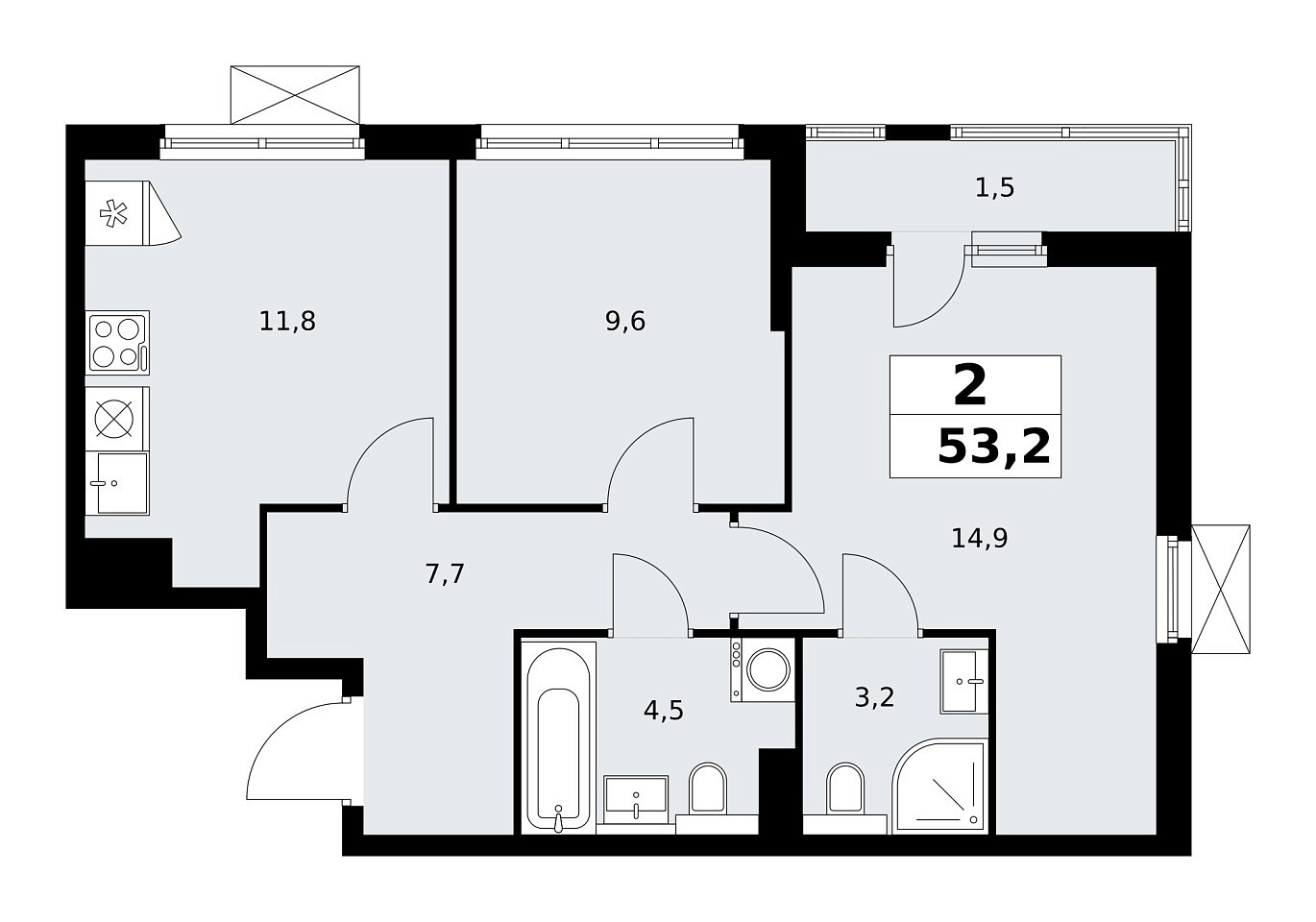 Количество комнат: 2, 53.2 кв.м.
