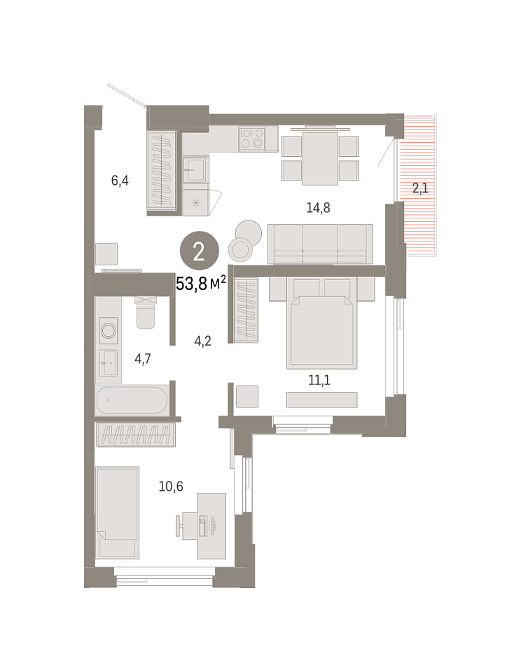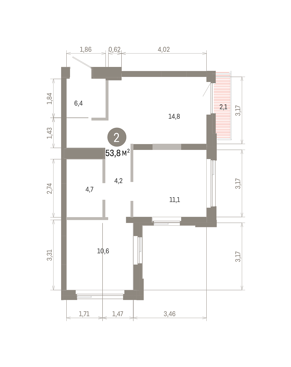 Количество комнат: 2, 53.82 кв.м.