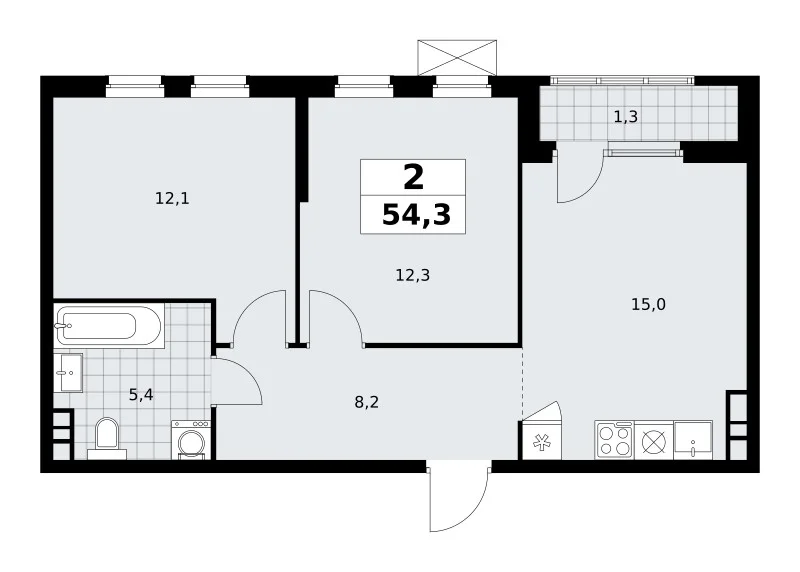 Количество комнат: 2, 54.3 кв.м.