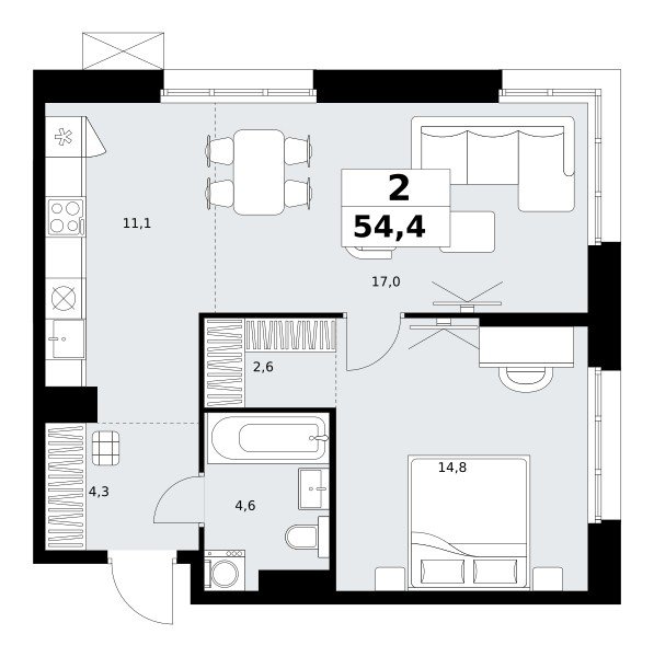 Площадь (общ/жил/кух), м2: 54.1/—/14.9