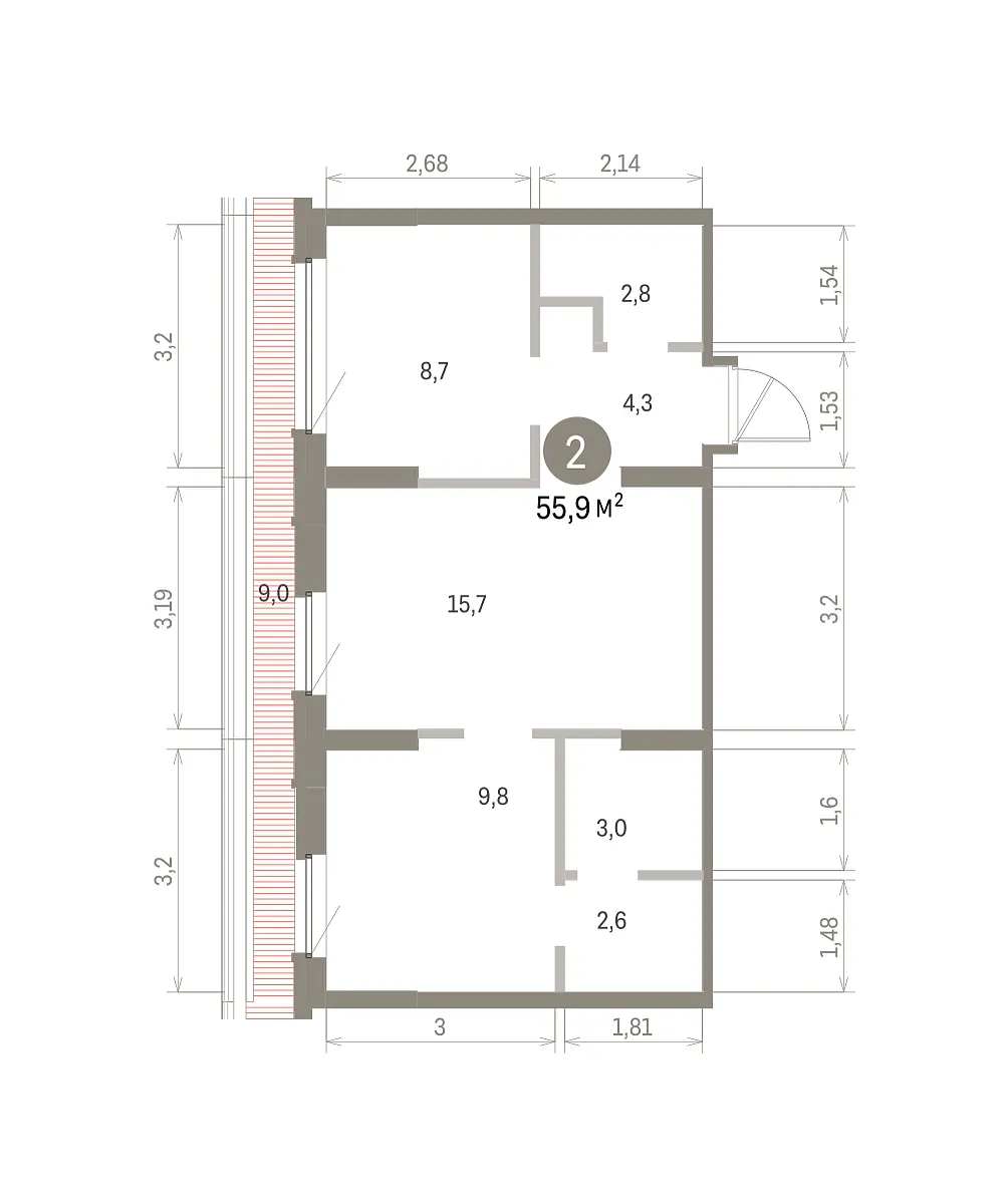 Площадь (общ/жил/кух), м2: 55.9/18.52/15.68