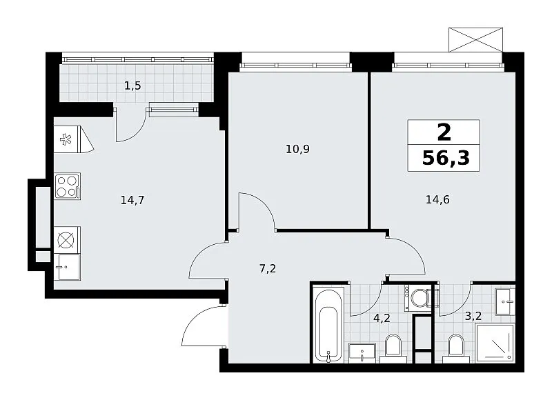 Количество комнат: 2, 56.3 кв.м.