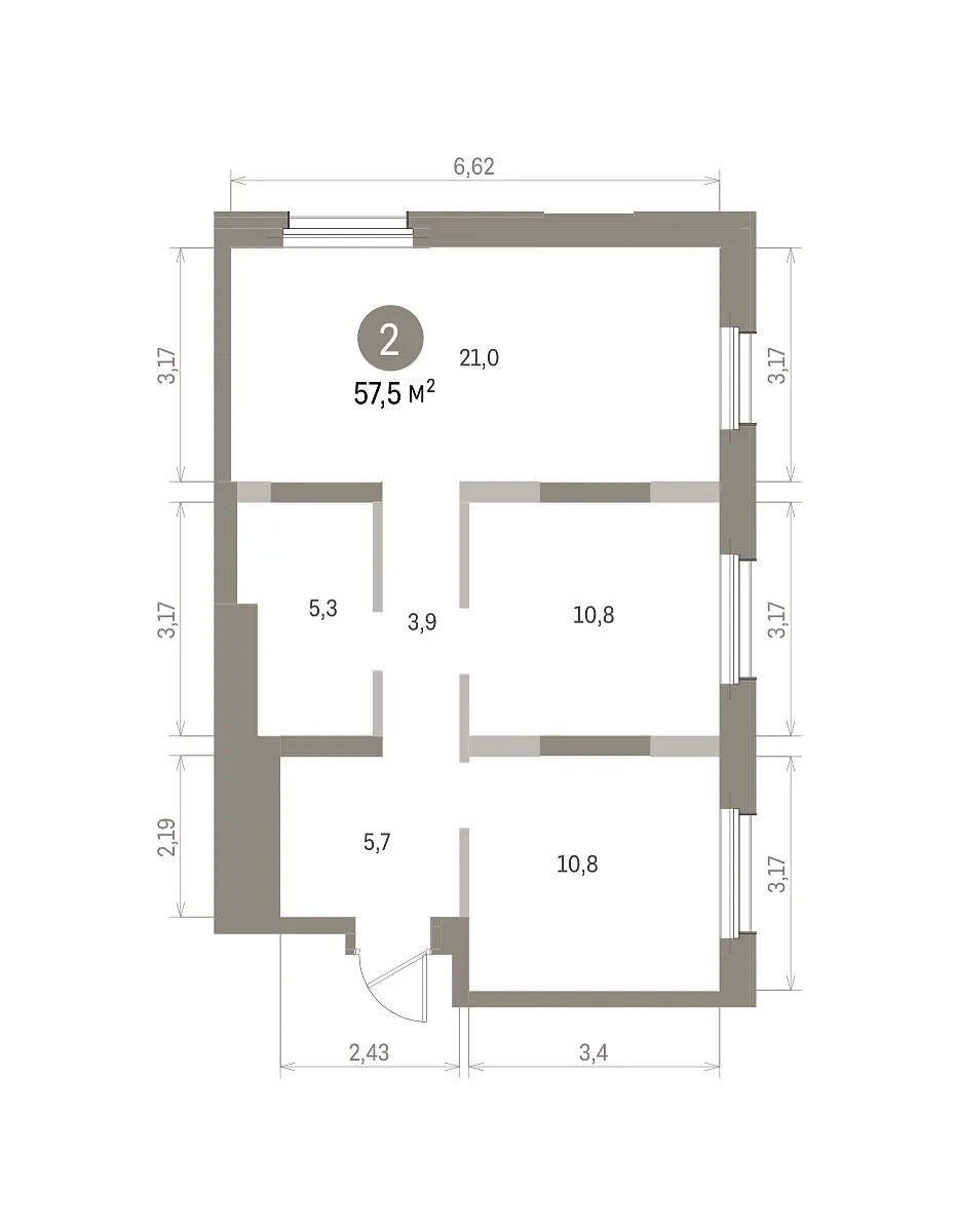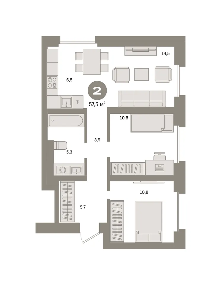 Количество комнат: 2, 57.5 кв.м.