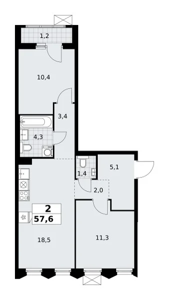 Количество комнат: 2, 57.6 кв.м.