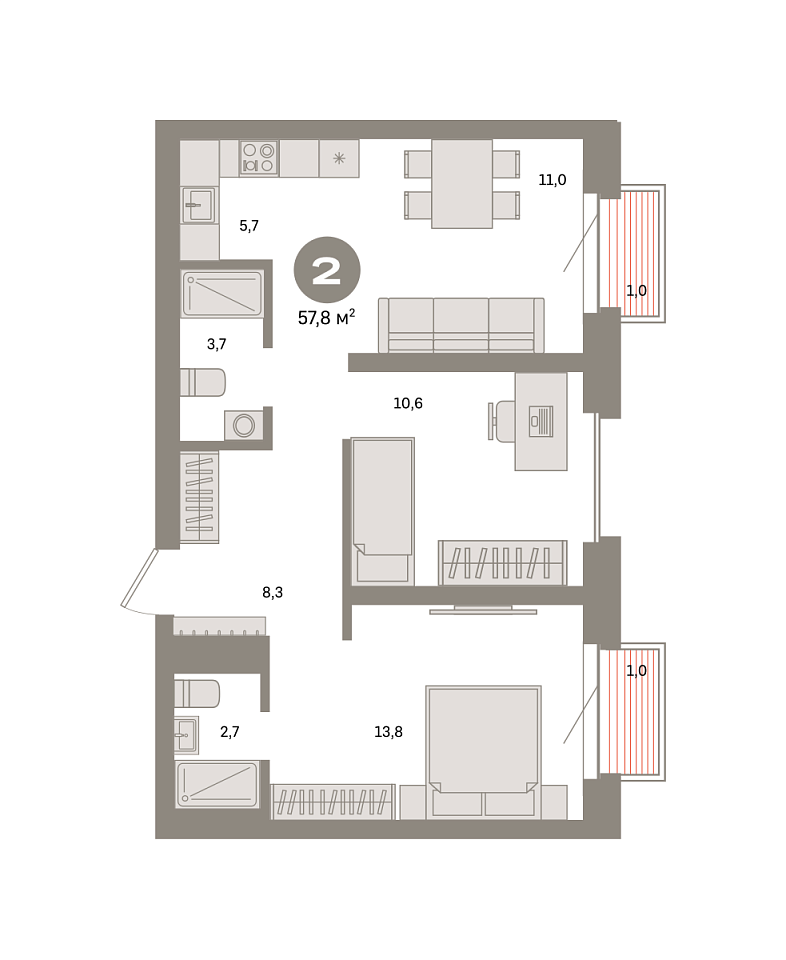 Площадь (общ/жил/кух), м2: 57.5/21.6/21