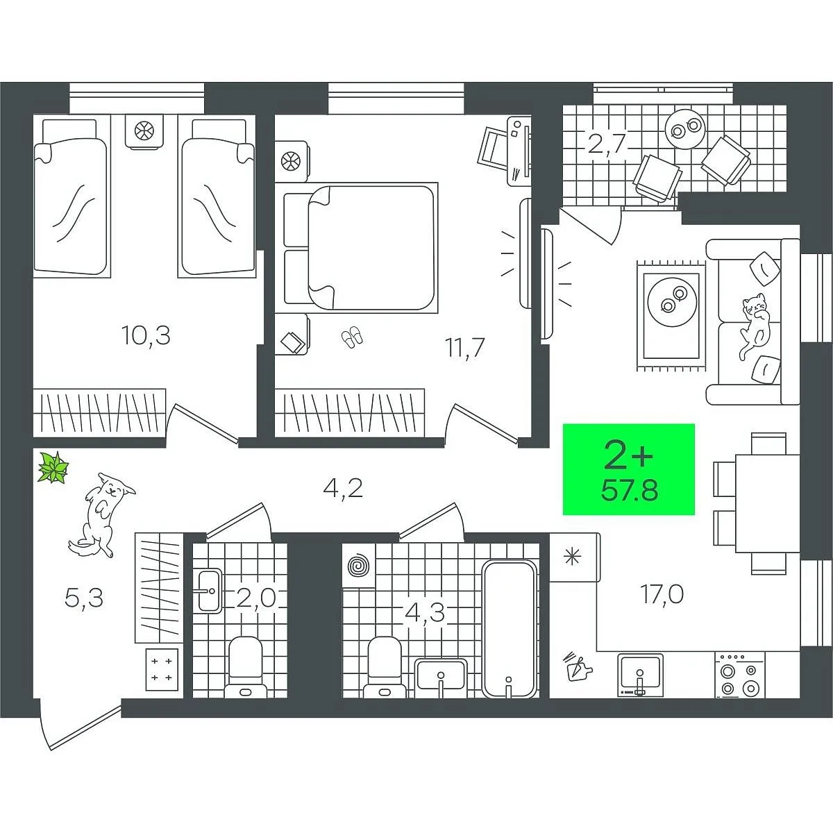 Количество комнат: 2, 57.84 кв.м.