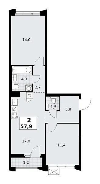 Площадь (общ/жил/кух), м2: 57.6/—/18.5