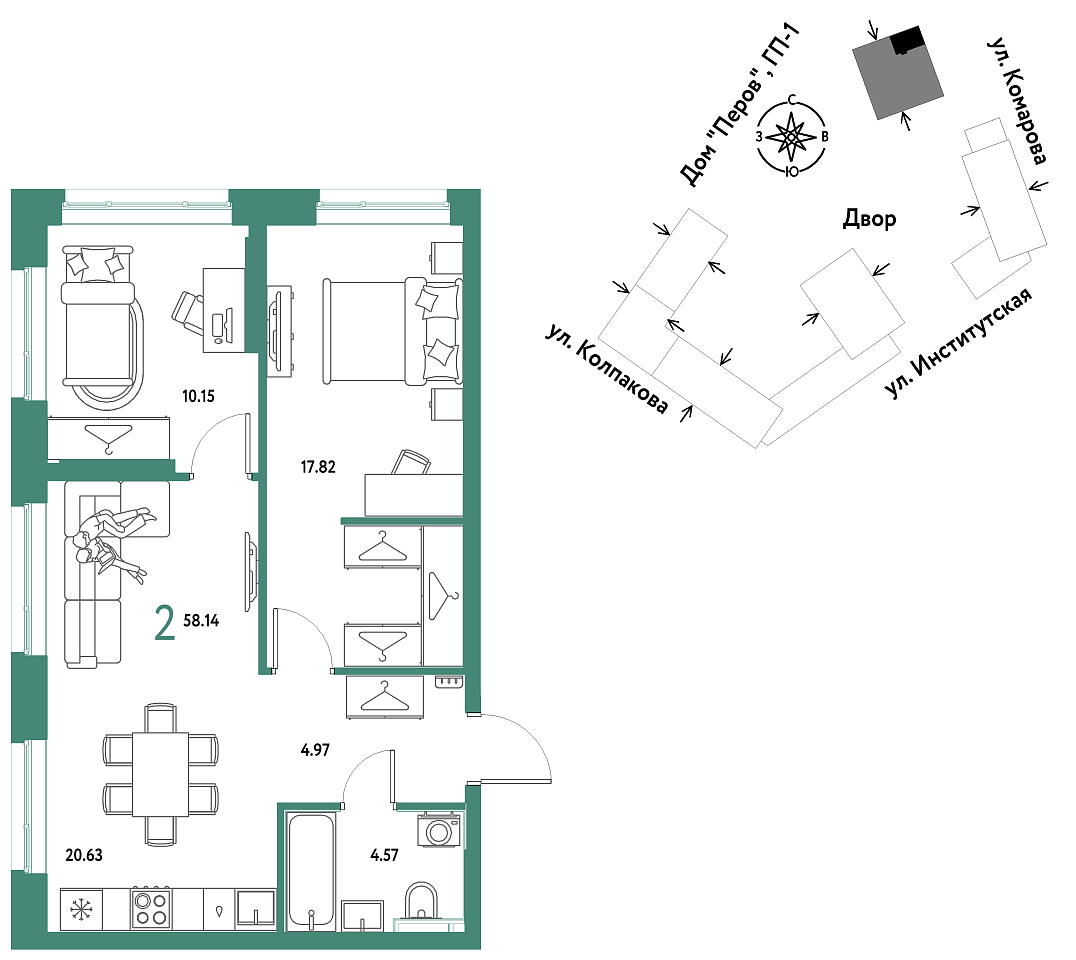 Количество комнат: 2, 58.14 кв.м.