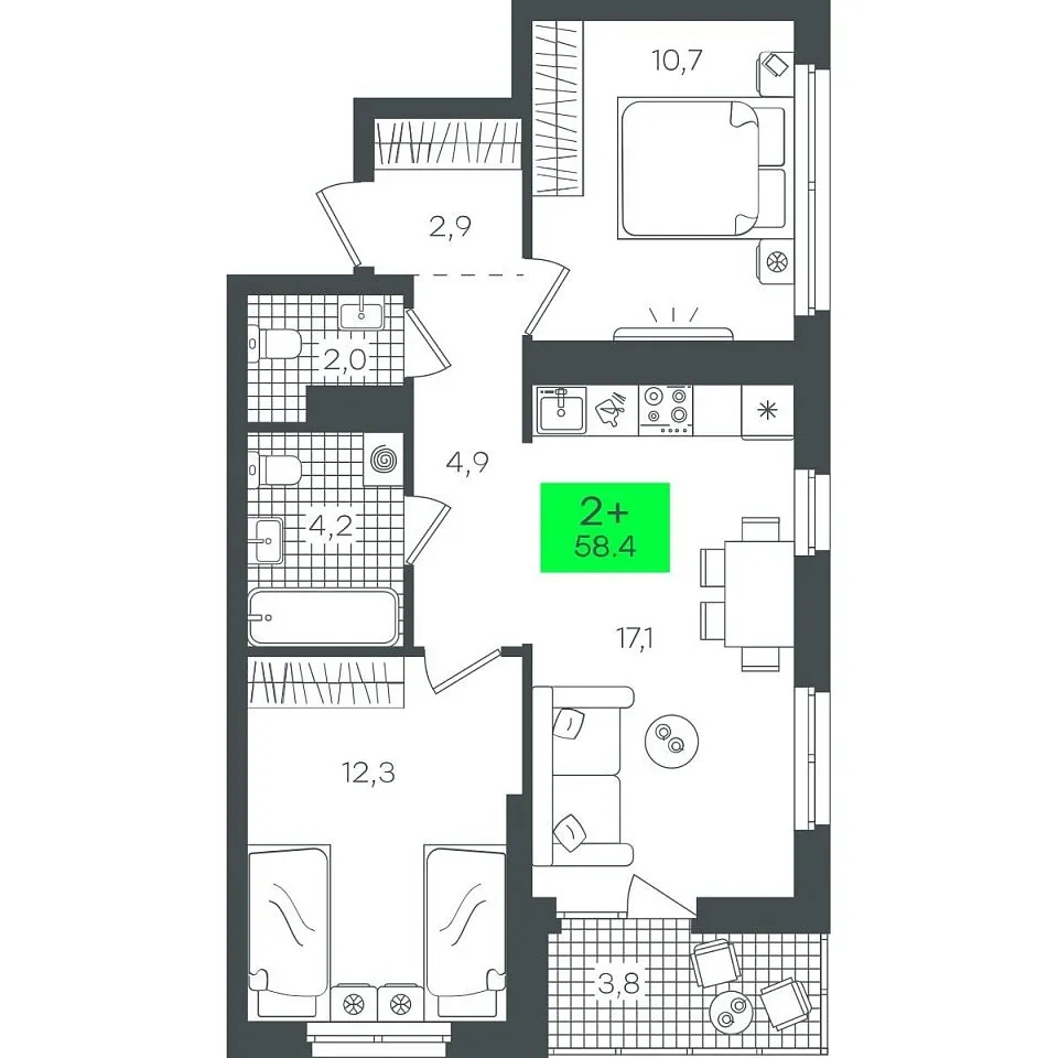 Количество комнат: 2, 58.4 кв.м.