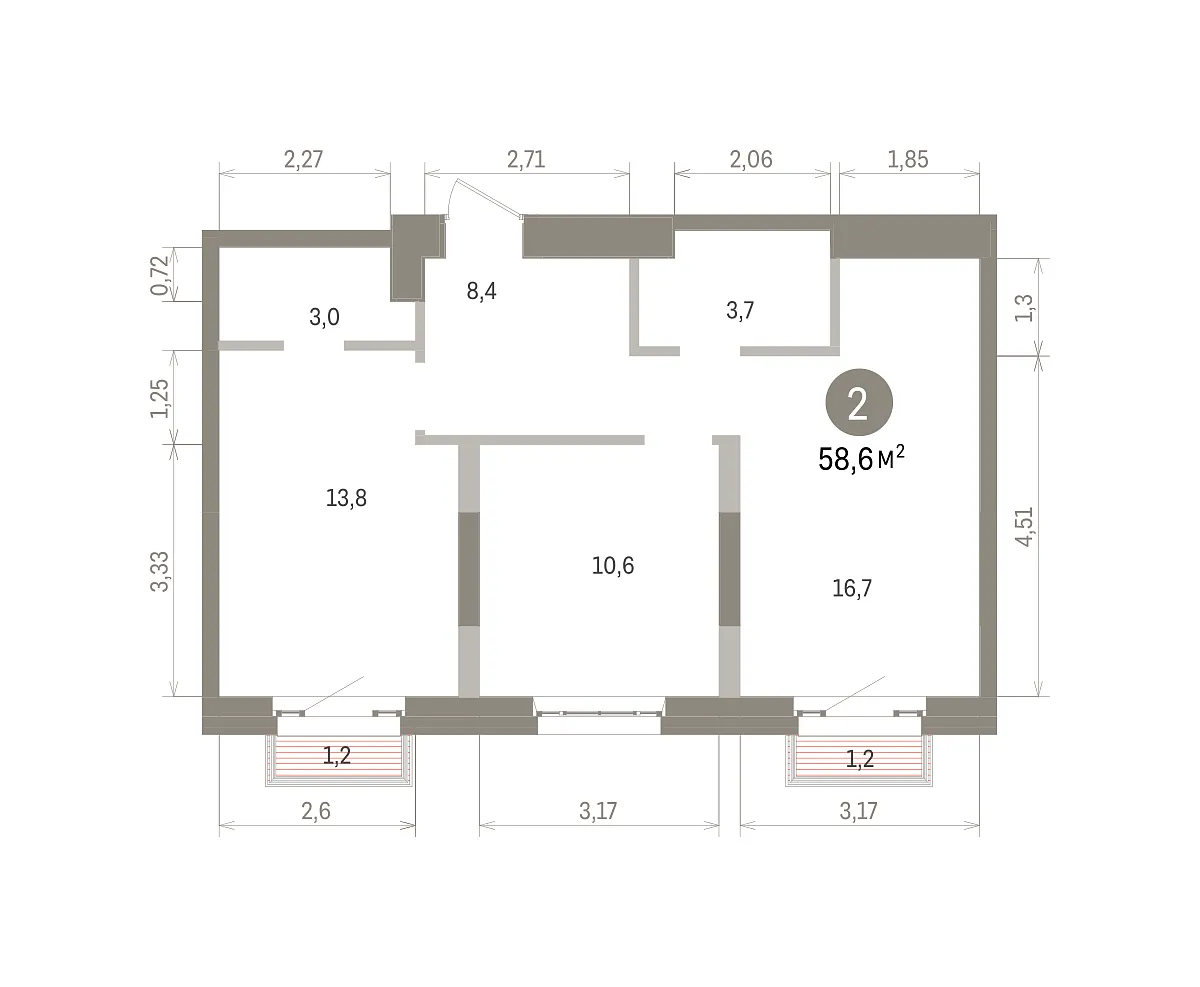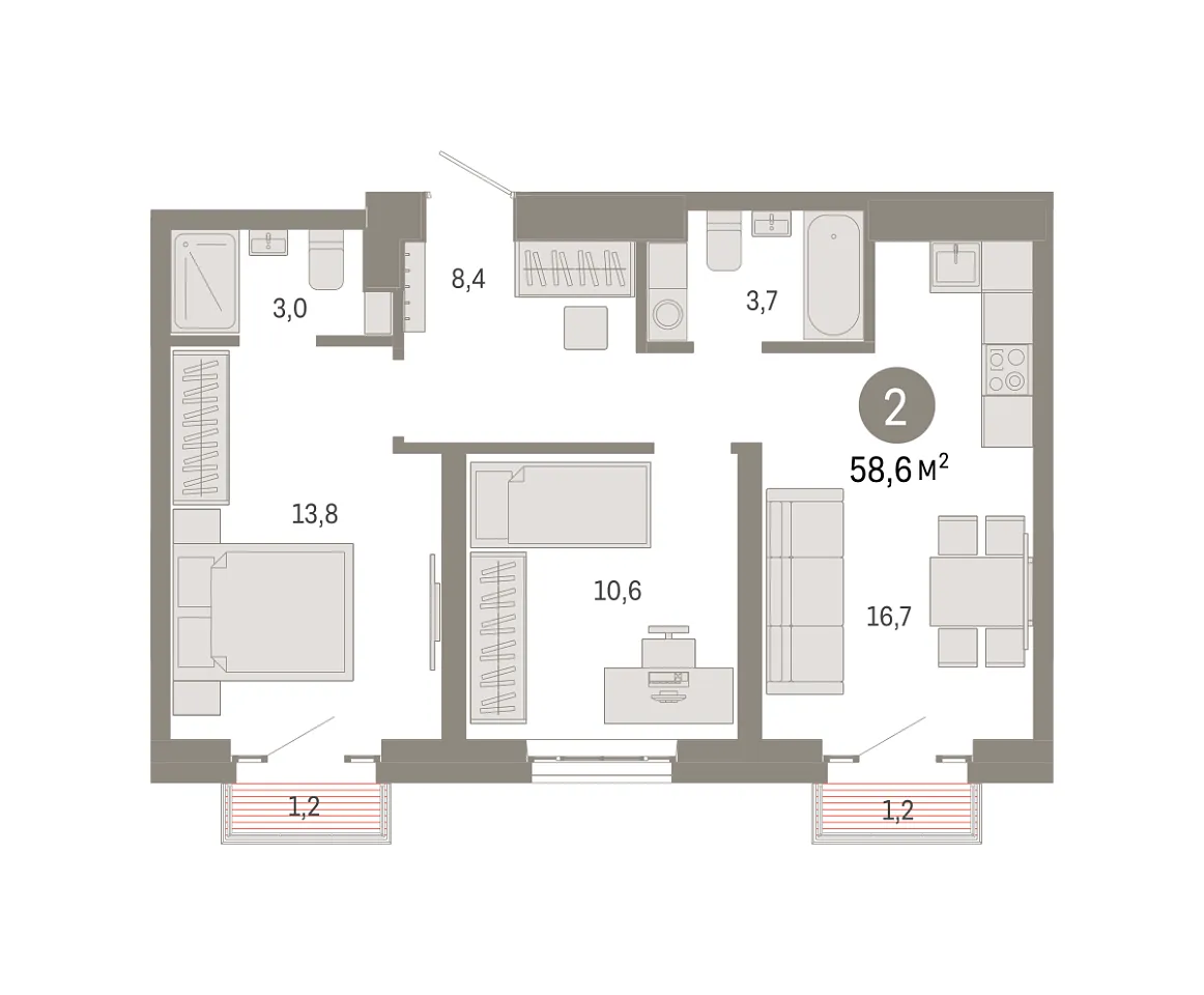 Количество комнат: 2, 58.6 кв.м.