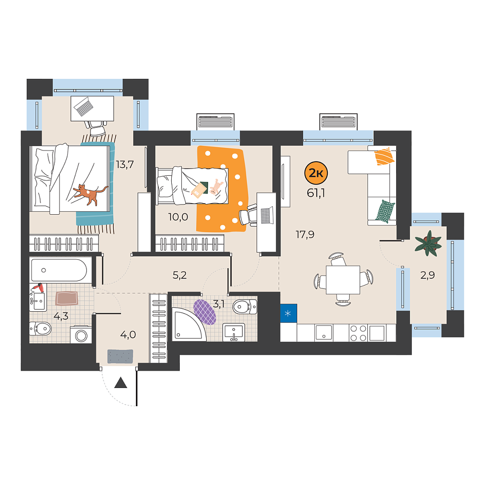 Купить новую двухкомнатную квартиру 59.1 м² на 9/25 этаже в ЖК «Корней», г. Тюмень за 10503000 ₽ | Агентство недвижимости «Вплюсе.Топ» — Недвижимость России