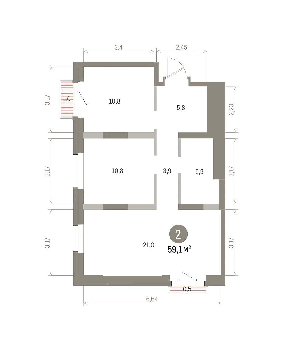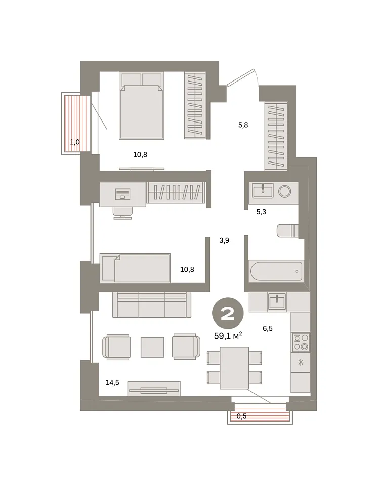 Количество комнат: 2, 59.1 кв.м.