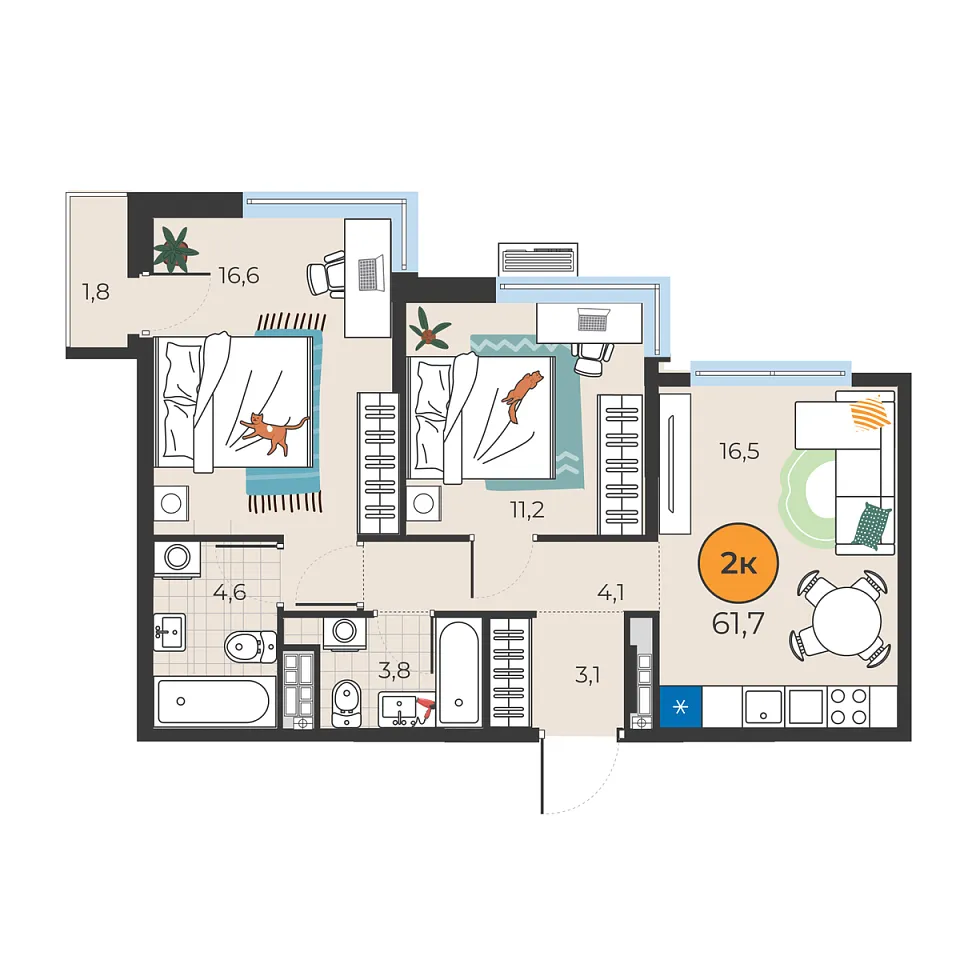 Купить новую двухкомнатную квартиру 59.9 м² на 9/25 этаже в ЖК «Корней», г. Тюмень за 8640000 ₽ | Агентство недвижимости «Вплюсе.Топ» — Недвижимость России
