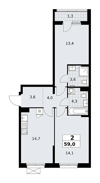 Количество комнат: 2, 59 кв.м.