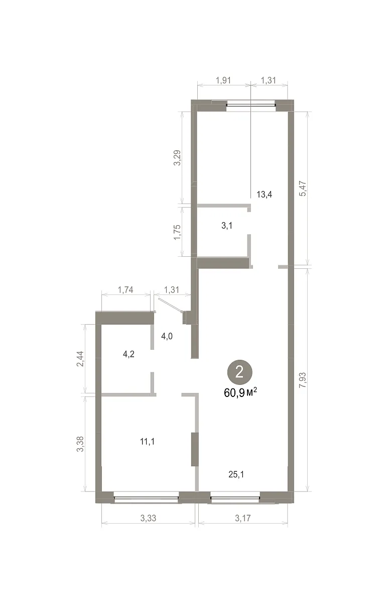 Количество комнат: 2, 60.91 кв.м.