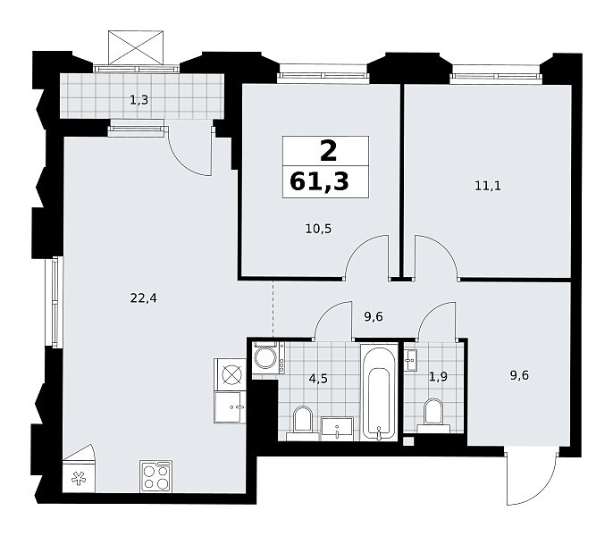 Количество комнат: 2, 61.3 кв.м.