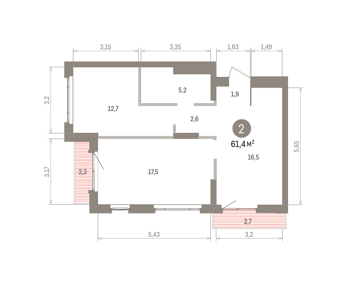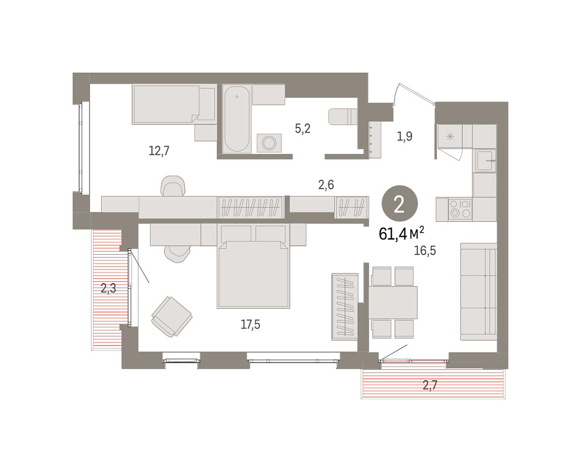 Количество комнат: 2, 61.4 кв.м.