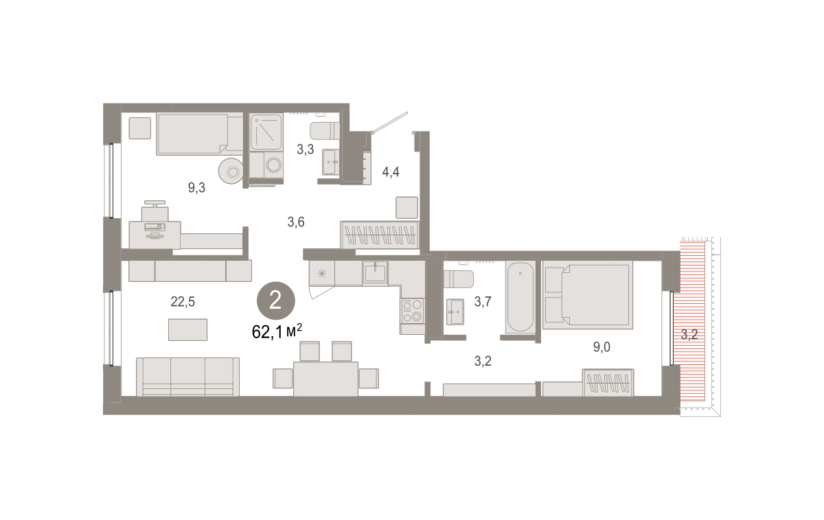Количество комнат: 2, 62.11 кв.м.