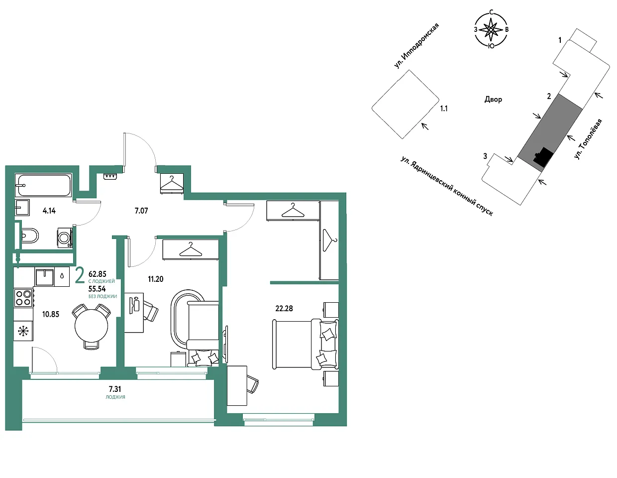 Количество комнат: 2, 62.85 кв.м.