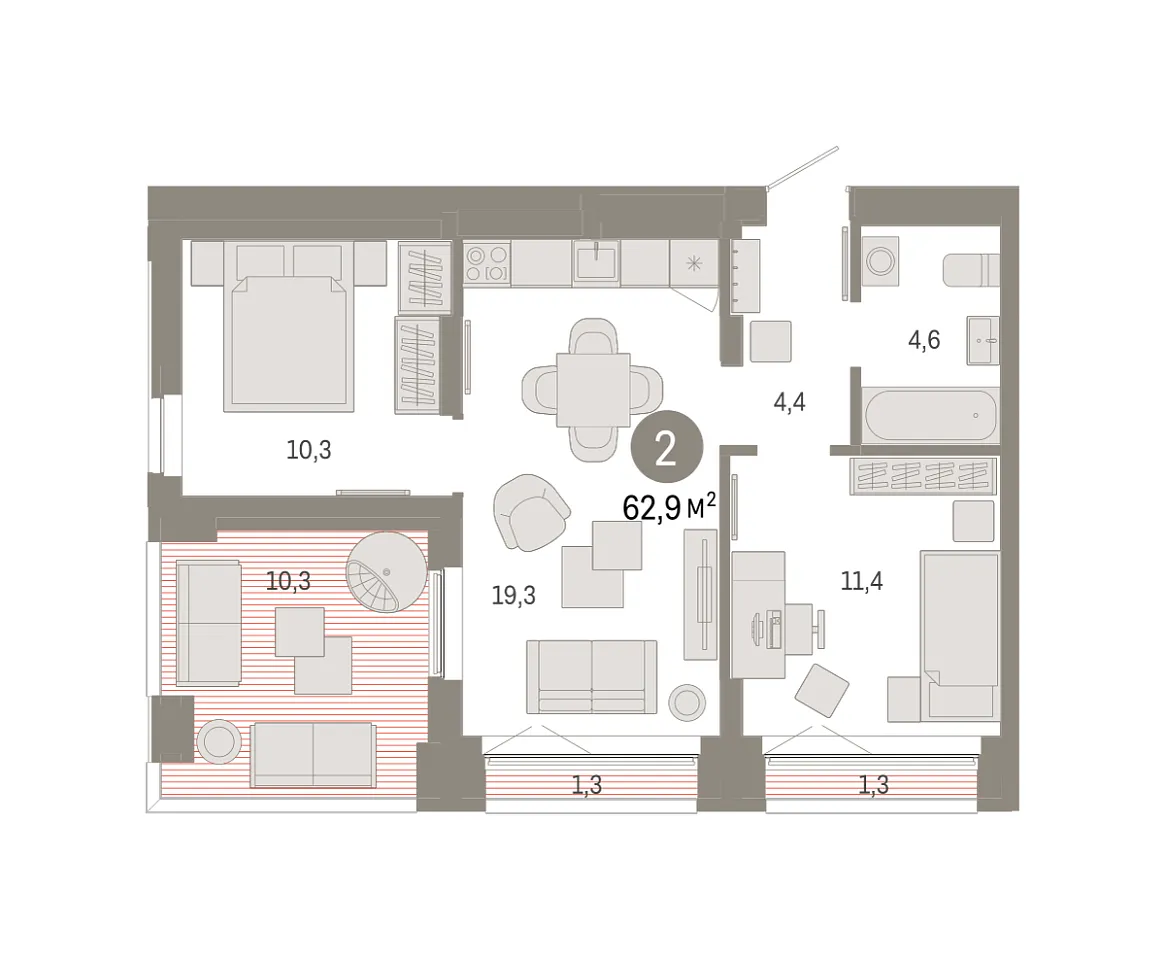 Количество комнат: 2, 62.9 кв.м.