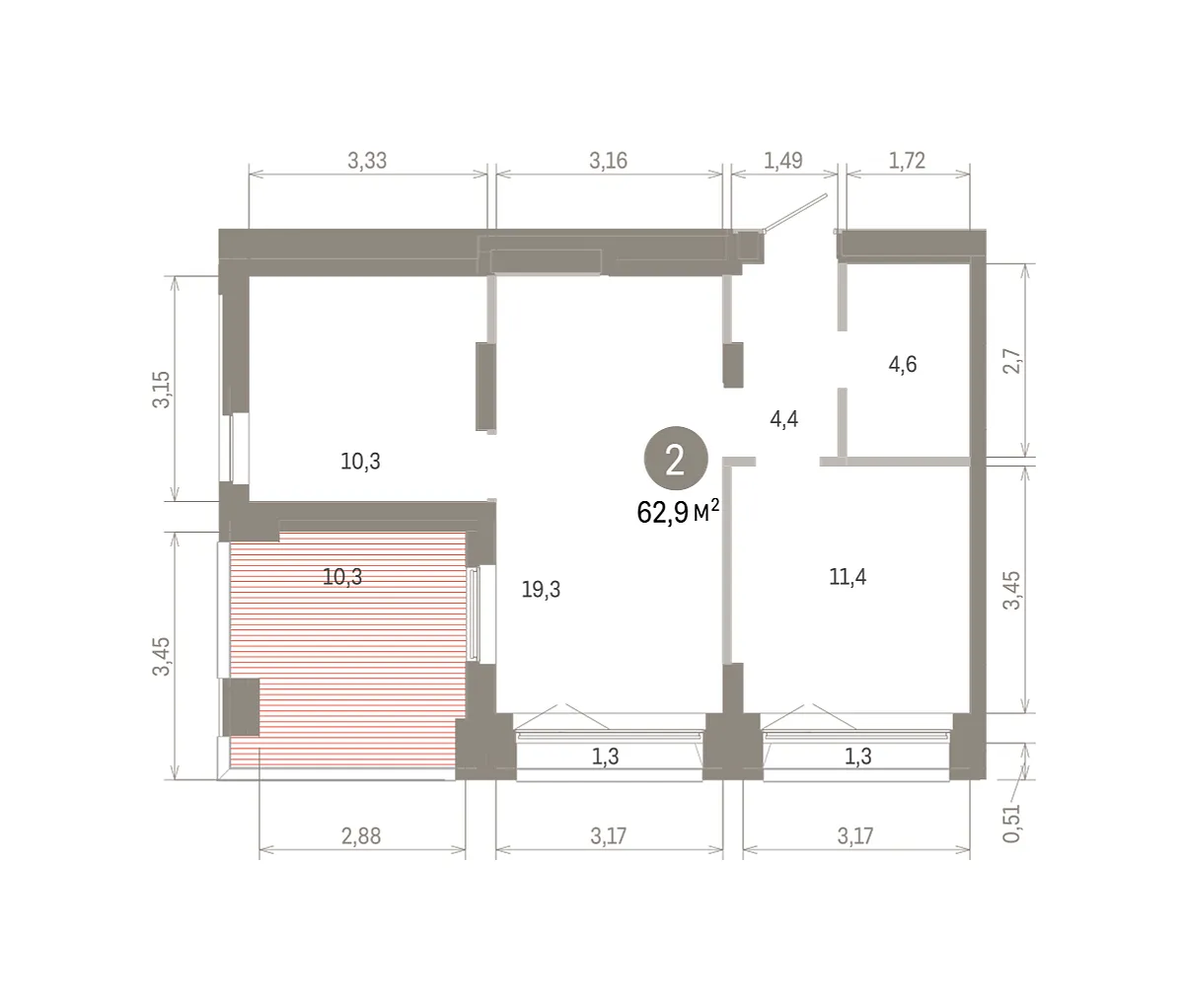 Общая площадь 62.9 м2